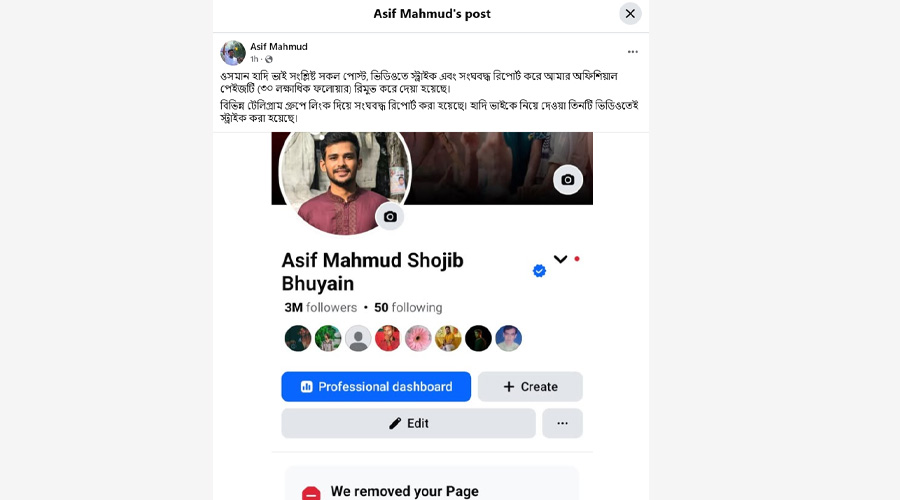 পোস্টে আসিফ বলেন, ওসমান হাদি ভাই সংশ্লিষ্ট সব পোস্ট, ভিডিওতে স্ট্রাইক এবং সংঘবদ্ধ রিপোর্ট করে আমার অফিশিয়াল পেইজটি (৩০ লাখের বেশি ফলোয়ার) রিমুভ করে দেয়া হয়েছে।