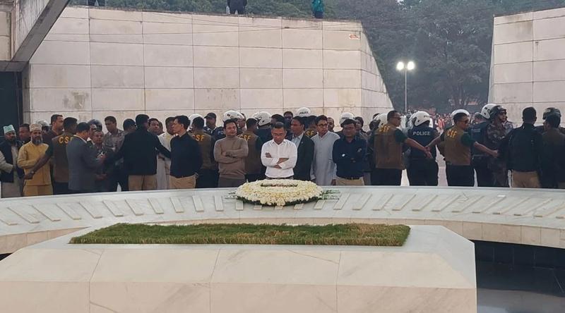 দলীয় নেতাদের সঙ্গে ফুল দেওয়া শেষে একাকী নীরবে দাঁড়িয়ে থাকেন তারেক রহমান। এরপর মোনাজাত করেন তিনি। মোনাজাত শেষে তাকে অনেকটা আবেগাপ্লুত হয়ে অশ্রুশিক্ত হতে দেখা যায়।