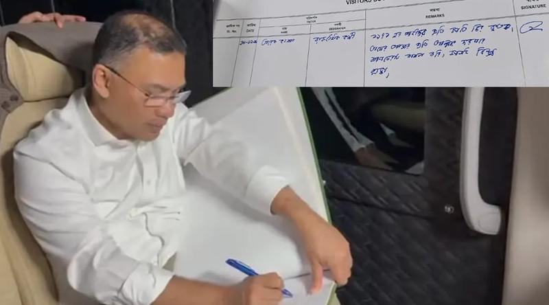 এসময় পরিদর্শন বইয়ে তারিখের জায়গায় বাংলায় আজকের ২৮-১২-২০২৫ তারিখ লিখেন। নামের স্থলে নিজের নাম তারেক রহমান লিখেন। এরপর নিজের পরিচয়ের স্থলে লিখেন, ’রাজনৈতিক কর্মী’।