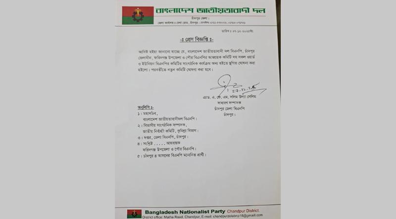 চিঠিতে উল্লেখ করা হয়, ফরিদগঞ্জ উপজেলা ও পৌর বিএনপির আহ্বায়ক কমিটিসহ সকল ওয়ার্ড ও ইউনিয়ন বিএনপির কমিটির সাংগঠনিক কার্যক্রম স্থগিত ঘোষণা করা হলো। পরবর্তীতে নতুন কমিটি ঘোষণা করা হবে।