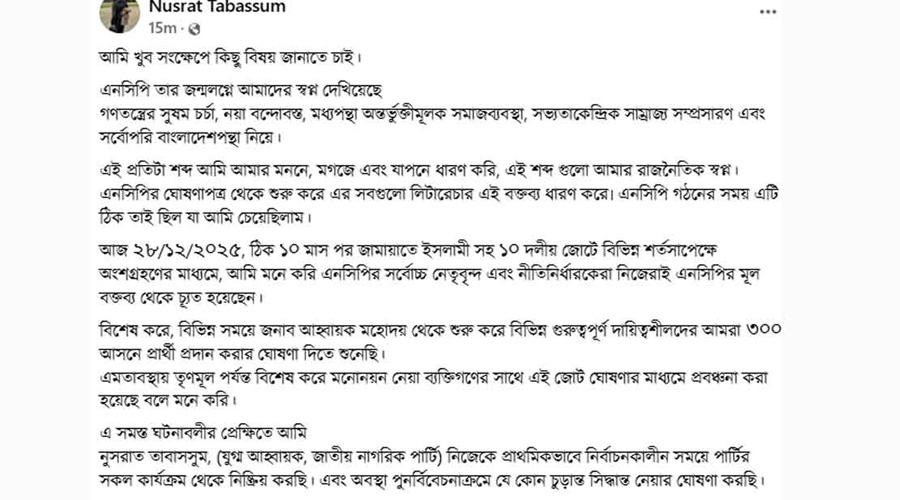 এমতাবস্থায় তৃণমূল পর্যন্ত বিশেষ করে মনোনয়ন নেয়া ব্যক্তিগণের সাথে এই জোট ঘোষণার মাধ্যমে প্রবঞ্চনা করা হয়েছে বলে মনে করি। এ সমস্ত ঘটনাবলীর প্রেক্ষিতে আমি নুসরাত তাবাসসুম, (যুগ্ম আহ্বায়ক, জাতীয় নাগরিক পার্টি) নিজেকে প্রাথমিকভাবে নির্বাচনকালীন সময়ে পার্টির সকল কার্যক্রম থেকে নিষ্ক্রিয় করছি। এবং অবস্থা পুনর্বিবেচনা ক্রমে যে কোনো চূড়ান্ত সিদ্ধান্ত নেওয়ার ঘোষণা করছি।