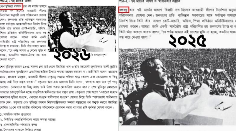 জাতীয় শিক্ষাক্রম ও পাঠ্যপুস্তক বোর্ড (এনসিটিবি) প্রকাশিত ২০২৬ সালের মাধ্যমিক স্তরের শিক্ষার্থীদের জন্য ‘বাংলাদেশ ও বিশ্বপরিচয়, পাঠ্যবই পর্যালোচনায় দেখা গেছে, শেখ মুজিবুর রহমানের নামের আগে বঙ্গবন্ধু শব্দটি বাদ দেওয়া হয়েছে। ২০২৬ সালের অষ্টম শ্রেণির জন্য ছাপানো ‘বাংলাদেশ ও বিশ্বপরিচয়’ পাঠ্যবইয়ের ২১ পৃষ্ঠায় ৭ মার্চের ভাষণের বর্ণনায় ৫ জায়গায় শুধু লেখা হয়েছে শেখ মুজিবুর রহমান। গত বছর ওই পাঁচটি জায়গায় শেখ মুজিবুর রহমানের আগে বঙ্গবন্ধু লেখা ছিল। তবে উক্ত পাঠ্যবইয়ের বিভিন্ন জায়গায় শেখ মুজিবুর রহমানকে আওয়ামী লীগ সভাপতি ও বাংলাদেশের রাষ্ট্রপতি বলে উল্লেখ করা হয়েছে।