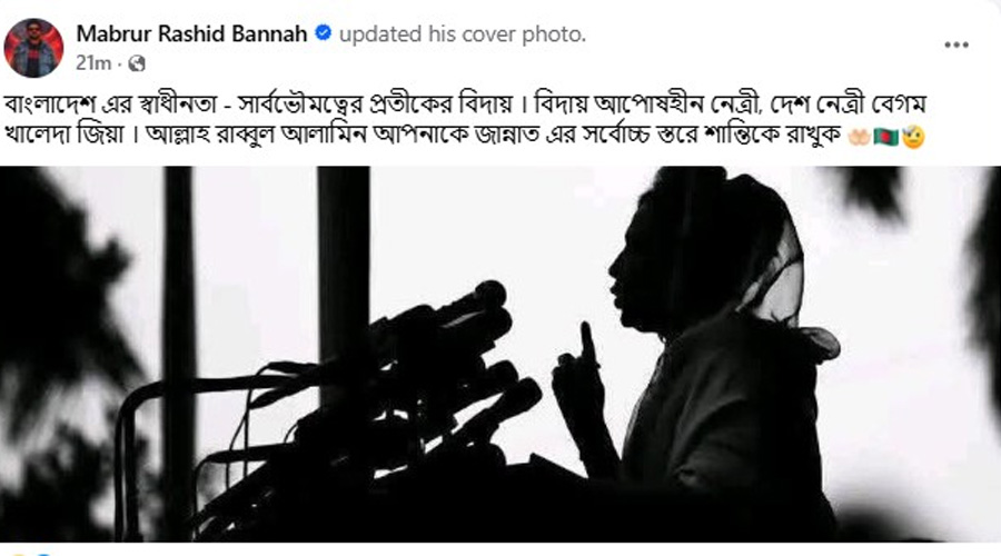 বিএনপি চেয়ারপারসন ও সাবেক প্রধানমন্ত্রী বেগম খালেদা জিয়ার ইন্তেকালে দেশজুড়ে নেমে এসেছে শোকের ছায়া। রাজনীতি, সংস্কৃতি ও সামাজিক অঙ্গনের বিশিষ্ট ব্যক্তিরা সামাজিক যোগাযোগমাধ্যমে এই আপোষহীন নেত্রীর মৃত্যুতে গভীর শোক ও শ্রদ্ধা জানাচ্ছেন। এ তালিকায় রয়েছেন দেশের জনপ্রিয় নির্মাতা মাবরুর রশিদ বান্নাহ।