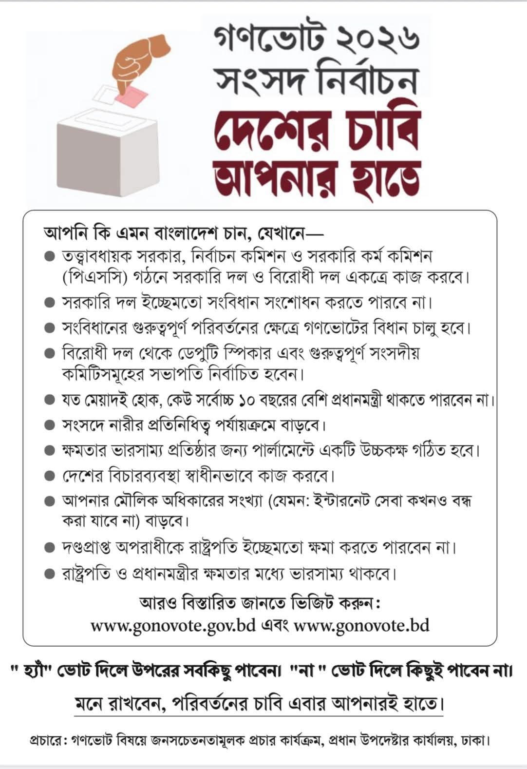 শুক্রবার (২ জানুয়ারি) প্রধান উপদেষ্টার ভেরিফায়েড ফেসবুকে পেজে গণভোটে ‘হ্যাঁ’ এবং ‘না’ ভোট নিয়ে একটি লিফলেট প্রচার করা হয়। এর শিরোনাম দেওয়া হয়েছে, ‘গণভোট ২০২৬ সংসদ নির্বাচন দেশের চাবি আপনার হাতে।’