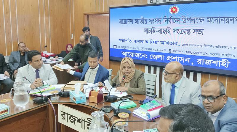ত্রয়োদশ জাতীয় সংসদ নির্বাচন উপলক্ষে মনোনয়ন যাচাই-বাছাই সংক্রান্ত সভা অনুষ্ঠিত হয়েছে। শনিবার (৩ জানুয়ারি) সকাল ১০টায় রাজশাহী জেলা প্রশাসকের কার্যালয়ে জেলা রিটার্নিং কর্মকর্তা আফিয়া আখতারের সভাপতিত্বে এ সভা অনুষ্ঠিত হয়। সভায় রাজশাহী-১ ও রাজশাহী-২ আসনের প্রার্থীরা উপস্থিত ছিলেন।