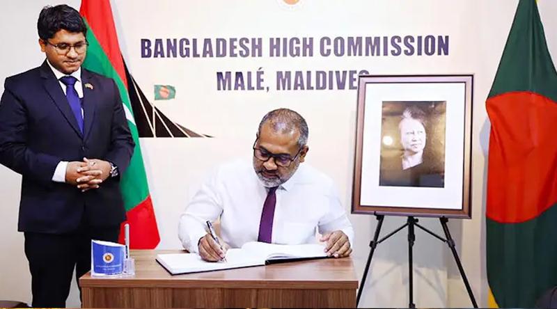 মালের বাংলাদেশ হাইকমিশন জানায়, পররাষ্ট্রমন্ত্রী উল্লেখ করেন যে, মালদ্বীপের রাষ্ট্রপতির বিশেষ দূত এবং উচ্চশিক্ষা, শ্রম ও দক্ষতা উন্নয়নমন্ত্রী ড. আলী হায়দার আহমেদ সম্প্রতি বাংলাদেশে প্রয়াত সাবেক প্রধানমন্ত্রীর জানাজায় অংশ নেন। এসময় তিনি বাংলাদেশের সরকার ও জনগণের প্রদত্ত আন্তরিক আতিথেয়তার ভূয়সী প্রশংসা করেন। শোক বইয়ে স্বাক্ষরকালে বাংলাদেশের হাইকমিশনার উপস্থিত ছিলেন এবং এই শোকাবহ সময়ে বাংলাদেশের জনগণের প্রতি সহমর্মিতা, সমবেদনা ও সমর্থন প্রকাশের জন্য মালদ্বীপের পররাষ্ট্রমন্ত্রীকে আন্তরিক ধন্যবাদ জানান। একই সঙ্গে তিনি গণতন্ত্র প্রতিষ্ঠা ও রক্ষায় খালেদা জিয়ার আজীবন সংগ্রাম, আত্মত্যাগ ও রাজনৈতিক অবদানের বিষয়টি শ্রদ্ধার সঙ্গে তুলে ধরেন।