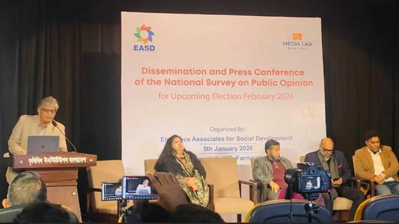 বেসরকারি সংস্থা এমিনেন্স অ্যাসোসিয়েটস ফর সোশ্যাল ডেভেলপমেন্ট (ইএএসডি) এই জনমত জরিপ চালায়। সোমবার (৫ জানুয়ারি) বিকেলে রাজধানীর ফার্মগেটে কেআইবি মিলনায়তনে জরিপের ফল তুলে ধরেন ইএএসডির প্রধান নির্বাহী কর্মকর্তা শামীম হায়দার তালুকদার।