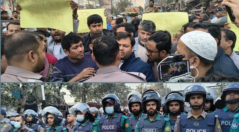 সরেজমিনে দেখা যায়, মার্চটি বাঁশতলায় পৌঁছালে পুলিশ সদস্যরা ব্যারিকেড দিয়ে আটকে দেন। এ সময় তারা নানা স্লোগান দিতে থাকেন।