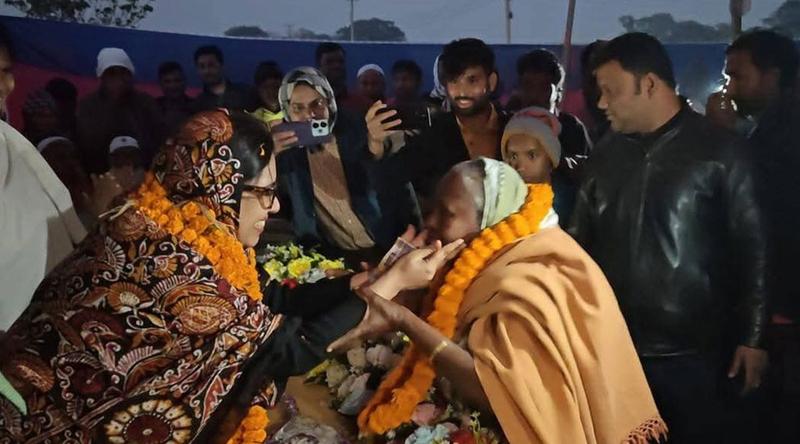 ব্রাহ্মণবাড়িয়া-২ (সরাইল-আশুগঞ্জ-বিজয়নগরের দুই ইউনিয়ন) আসনের স্বতন্ত্র প্রার্থী ব্যারিস্টার রুমিন ফারহানাকে মালা দিতে এসে অর্থ উপহার দিয়েছেন এক বৃদ্ধা।