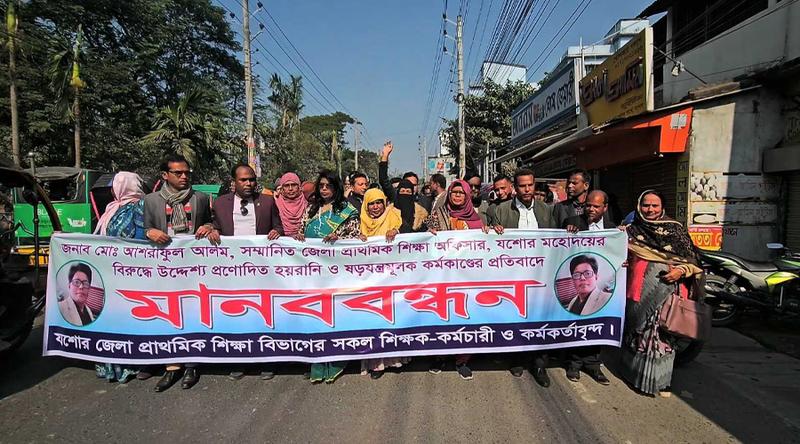 রোববার (১১ জানুয়ারি) দুপুরে যশোর সার্কিট হাউজের সামনে থেকে বিক্ষোভ মিছিল বের করেন তারা। মিছিলটি শহরের প্রধান সড়ক প্রদক্ষিণ করে প্রেসক্লাব এসে শেষ হয়। এরপর সেখানে মানববন্ধন অনুষ্ঠিত হয়। মানববন্ধনে বিক্ষোভকারীরা শিক্ষা কর্মকর্তার মুক্তি দাবি করে বিভিন্ন স্লোগান দেন।