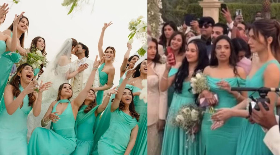 এদিন সাদা পোশাকে সেজে স্টেবিনের সঙ্গে খ্রিষ্টান মতে বিয়ে সারেন নূপুর। স্বাভাবিকভাবেই তাঁদের দু’জনের চোখেমুখে উপচে পড়েছিল খুশি। বিয়ে শেষে একে অপরের ঠোঁটে ঠোঁট রেখে চুমু খান। সাদা থিমে এদিন সেজেছিল তাঁদের বিয়ের আসর। বোনের বিয়েতে সবুজ রঙের পোশাকে সেজেছিলেন কৃতী নিজে। এককথায় বলা যায় রূপকথার সাক্ষী থাকলেন সকলে। কারা ছিলেন এদিন আমন্ত্রিত হিসেবে তাঁদের বিয়ের আসরে? প্রথম থেকেই শোনা গিয়েছিল যে, ঘনিষ্ঠজনেদের উপস্থিতিতেই বসবে সেই কৃতীর বোনের বিয়ের আসর। এদিন কৃতীর বোনের বিয়েতে অতিথি হিসেবে আমন্ত্রিতদের তালিকায় ছিলেন বলিউদের দুই অভিনেত্রী দিশা পাটানি ও মৌনী রায়। বলে রাখা ভালো, এদিনের বিয়ের আসরে নিজেদের তোলা নিজস্বী সোশাল মিডিয়ায় শেয়ার করে নিয়েছেন তাঁরা। শুধু তাই নয় ওই বিয়ের আসরে দেখা গিয়েছে কৃতীর চর্চিত বয়ফ্রেন্ড কবীর বাহিয়াকেও। যদিও একসঙ্গে দু’জনকেই দেখা গিয়েছিল মুম্বইয়ের বিমানবন্দরে উদয়পুরের উদ্দেশ্যে রওনা দিতে।