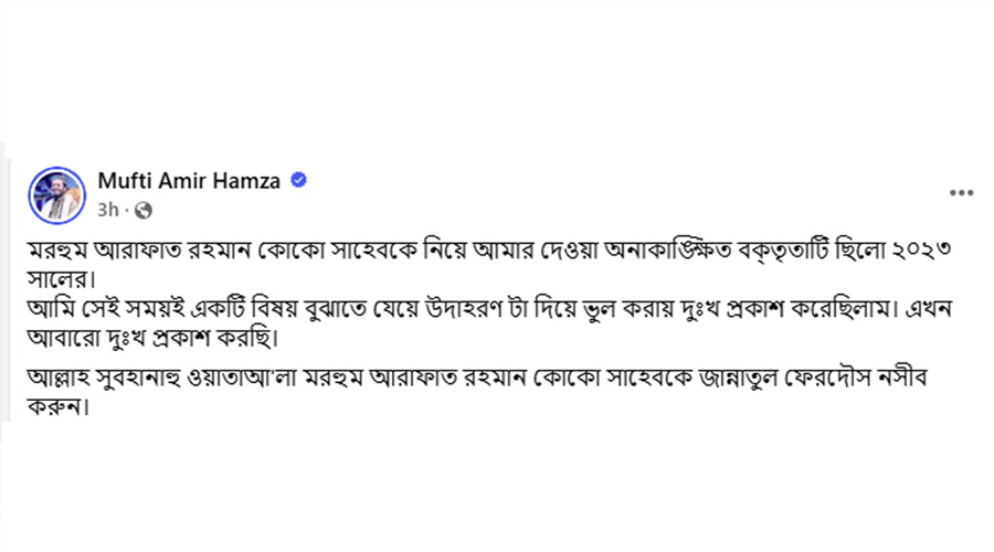 মুফতি আমির হামজা লিখেছেন, মরহুম আরাফাত রহমান কোকো সাহেবকে নিয়ে আমার দেওয়া অনাকাঙ্ক্ষিত বক্তৃতাটি ছিল ২০২৩ সালের। আমি সেই সময়ই একটি বিষয় বোঝাতে যেয়ে উদাহরণটা দিয়ে ভুল করায় দুঃখ প্রকাশ করেছিলাম। এখন আবারও দুঃখ প্রকাশ করছি।