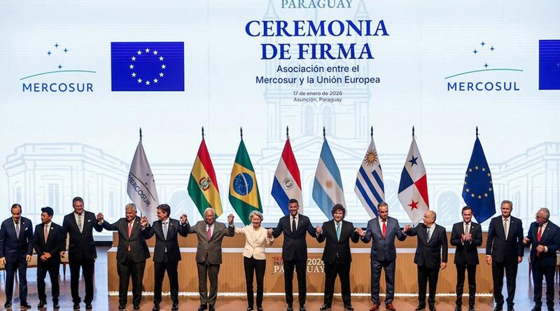 দীর্ঘ ২৫ বছরের আলোচনার পর অবশেষে আলোর মুখ দেখল ইউরোপীয় ইউনিয়ন ও দক্ষিণ আমেরিকার বাণিজ্যিক জোট মার্কোসুরের মুক্ত বাণিজ্য চুক্তি। গতকাল শনিবার প্যারাগুয়েতে আয়োজিত এক অনুষ্ঠানে ইউরোপীয় কমিশনের প্রেসিডেন্ট উরসুলা ভন ডার লিয়েন এবং মার্কোসুরভুক্ত দেশগুলোর (আর্জেন্টিনা, ব্রাজিল, প্যারাগুয়ে ও উরুগুয়ে) প্রতিনিধিরা এতে স্বাক্ষর করেন।