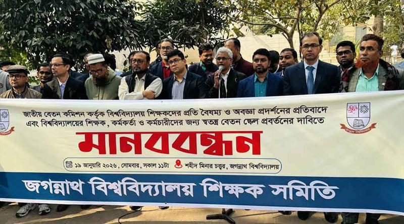 জাতীয় বেতন কমিশন কর্তৃক বিশ্ববিদ্যালয় শিক্ষকদের প্রতি বৈষম্য ও অবজ্ঞা প্রদর্শনের প্রতিবাদে এবং বিশ্ববিদ্যালয়ের শিক্ষক, কর্মকর্তা ও কর্মচারীদের জন্য স্বতন্ত্র বেতন স্কেল প্রবর্তনের দাবিতে মানববন্ধন করেছে জগন্নাথ বিশ্ববিদ্যালয় (জবি) শিক্ষক সমিতি।