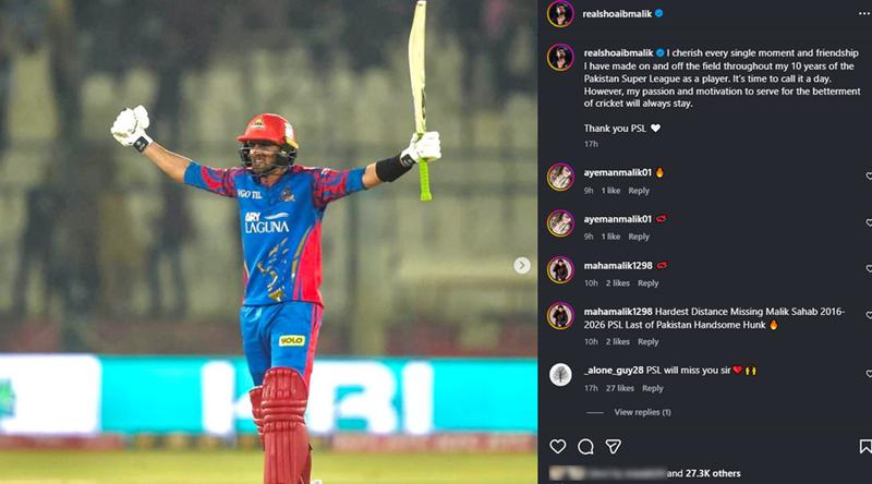 নিজের ইনস্টাগ্রাম অ্যাকাউন্টে দেওয়া ছোট একটি পোস্টে শোয়েব মালিক লিখেছেন, ‘পাকিস্তান সুপার লিগের ১০ বছরজুড়ে মাঠে ও মাঠের বাইরে গড়ে ওঠা প্রতিটি ছোট মুহূর্ত এবং বন্ধুত্বের স্মৃতিই আমি লালন করি। এবার বিদায় বলার সময় হয়েছে।’ ভিন্ন ভূমিকায় তাকে ক্রিকেটের সঙ্গে দেখা যেতে পারে বলেও ইঙ্গিত রয়েছে পরবর্তী অংশে, ‘ক্রিকেটকে আরও উন্নতির জায়গায় নিতে আমার আবেগ এবং প্রেরণা সব সময়ই থাকবে। ধন্যবাদ পিএসএল।’