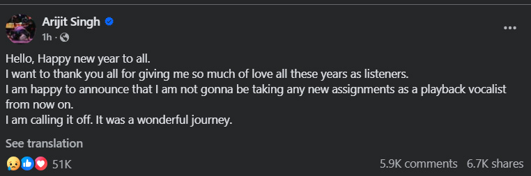 তবে সংগীত অনুরাগীদের জন্য এবার বড় এক দুঃসংবাদ দিলেন ভারতের জনপ্রিয় কণ্ঠশিল্পী অরিজিৎ সিং। আর কোনো নতুন সিনেমার গানে (প্লেব্যাক) কণ্ঠ দেবেন না বলে ঘোষণা দিয়েছেন তিনি।
