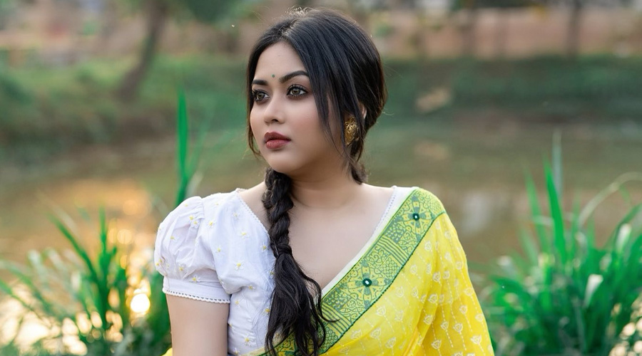 সবুজ ঘাসে বসে থাকা যেন এক টুকরো হলুদ রোদ ঠিক এমনই এক মায়াবী আবহে ধরা দিয়েছেন। যেখানে গ্রামবাংলার চিরায়ত রূপ আর আধুনিক মননশীলতার এক দারুণ মেলবন্ধন দেখা গেছে।