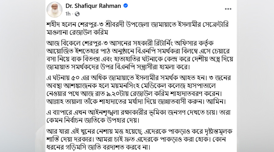 জামায়াতে ইসলামীর আমির পোস্টে লিখেন, ‘শহীদ হলেন শেরপুর-৩ শ্রীবরদী উপজেলা জামায়াতে ইসলামীর সেক্রেটারি মাওলানা রেজাউল করিম। আজ বিকেলে শেরপুর-৩ আসনের সহকারী রিটার্নিং অফিসার কর্তৃক আয়োজিত ইশতেহার পাঠ অনুষ্ঠানে বিএনপি সমর্থকরা বিলম্বে এসে চেয়ারে বসা নিয়ে বাগ্‌বিতণ্ডা এবং হাতাহাতির ঘটনাকে কেন্দ্র করে দেশীয় অস্ত্র দিয়ে জামায়াত সমর্থকদের ওপর বিএনপি সন্ত্রাসীরা হামলা করে।’
