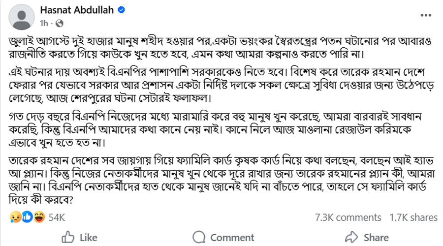 ফেসবুক পোস্টে তিনি লেখেন, বিশেষ করে তারেক রহমান দেশে ফেরার পর যেভাবে সরকার আর প্রশাসন একটা নির্দিষ্ট দলকে সকল ক্ষেত্রে সুবিধা দেওয়ার জন্য উঠে পড়ে লেগেছে, আজ শেরপুরের ঘটনা সেটারই ফলাফল।