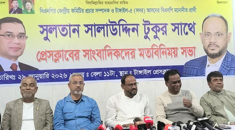 বিএনপির কেন্দ্রীয় প্রচার সম্পাদক ও টাঙ্গাইল-৫ (সদর) আসনে মনোনীত এমপি প্রার্থী সুলতান সালাউদ্দিন টুকু টাঙ্গাইলের সাংবাদিকদের সঙ্গে মতবিনিময় করেছেন।