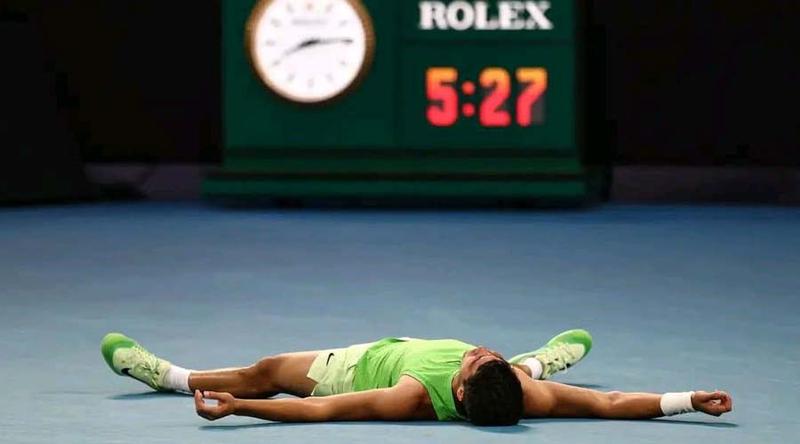 ২২ বছর বয়সী আলকারেজ প্রথমবার অস্ট্রেলিয়ান ওপেনের ফাইনালে উঠলেন। সর্বকনিষ্ঠ পুরুষ খেলোয়াড় হিসেবে ক্যারিয়ার গ্র্যান্ড স্লাম জেতার খুব কাছে তিনি। প্রথম সেট ৬-৪ এ জিতে ম্যাচের নিয়ন্ত্রণ নেন আলকারাজ। দ্বিতীয় সেটে টাইব্রেকে জেতেন। তৃতীয় সেট জমে ওঠে নাটকীয়তায়, যখন আলকারাজ ঊরু ও কুঁচকির ব্যথায় মেডিক্যাল টাইম আউট চান।