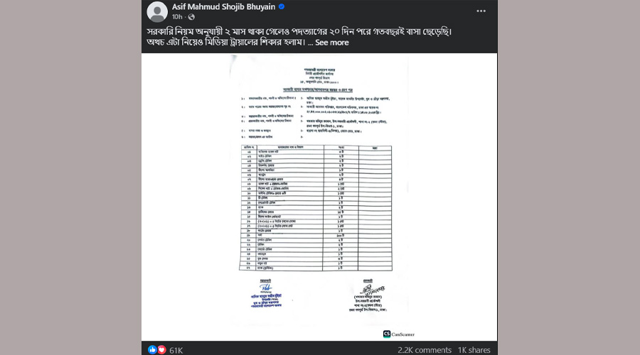 ফেসবুক পোস্টে আসিফ মাহমুদ সজীব ভূঁইয়া লেখেন, ‌‘সরকারি নিয়ম অনুযায়ী ২ মাস থাকা গেলেও পদত্যাগের ২০ দিন পরে গতবছরই বাসা ছেড়েছি। অথচ এটা নিয়েও মিডিয়া ট্রায়ালের শিকার হলাম।’