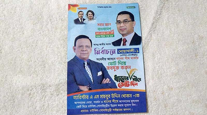 নোয়াখালী-১ আসনে ঘরে ঘরে ধানের শীষের রঙিন লিফলেট বিতরণ করছেন বিএনপি মনোনীত প্রার্থী ব্যারিস্টার এ এম মাহবুব উদ্দিন খোকন ও তার লোকজন। এতে দলীয় প্রধান ছাড়াও প্রতিষ্ঠাতাসহ একাধিক ছবি ব্যবহার করলেও প্রশাসনের নীরব থাকার অভিযোগ উঠেছে।