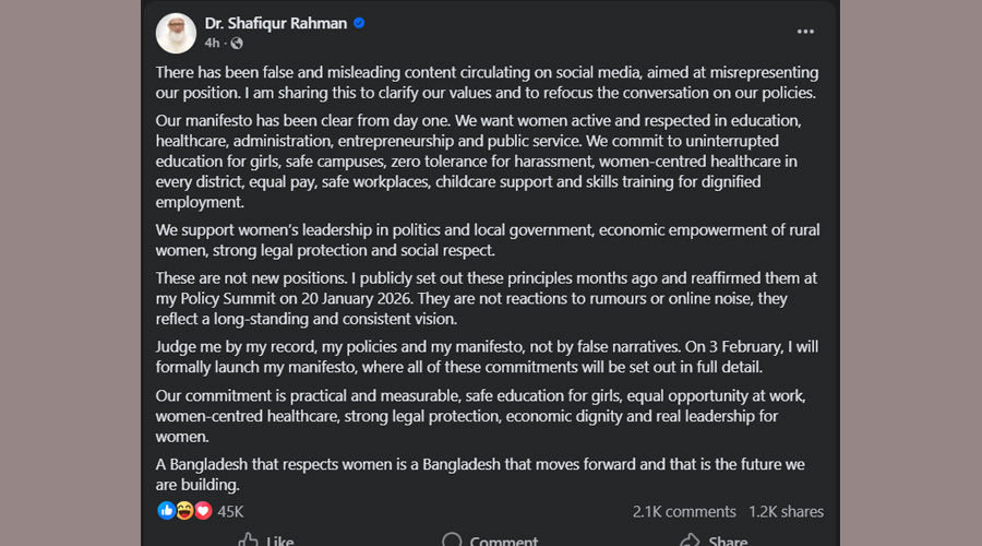তিনি বলেন, আমার রেকর্ড, নীতি এবং আমার ইশতেহার দিয়ে আমাকে বিচার করুন, মিথ্যা বর্ণনা দিয়ে নয়। ৩ ফেব্রুয়ারি, আমি আনুষ্ঠানিকভাবে আমার ইশতেহার প্রকাশ করব, যেখানে এই সমস্ত প্রতিশ্রুতি বিস্তারিত বর্ণনা করা হবে। আমাদের অঙ্গীকার বাস্তবসম্মত এবং পরিমাপযোগ্য, মেয়েদের জন্য নিরাপদ শিক্ষা, কর্মক্ষেত্রে সমান সুযোগ, নারী-কেন্দ্রিক স্বাস্থ্যসেবা, শক্তিশালী আইনি সুরক্ষা, অর্থনৈতিক মর্যাদা এবং নারীদের জন্য প্রকৃত নেতৃত্ব।
