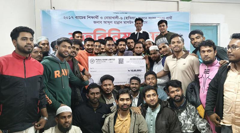 নোয়াখালী-৬ (হাতিয়া) আসনের ১১ দলীয় জোট মনোনীত সংসদ সদস্য প্রার্থী ও জাতীয় নাগরিক পার্টির (এনসিপি) সিনিয়র যুগ্ম মুখ্য সমন্বয়ক আবদুল হান্নান মাসউদের নির্বাচনী তহবিলে ১০ লাখ টাকা অনুদান দিয়েছেন তার বন্ধু ও মাদরাসার সহপাঠীরা।