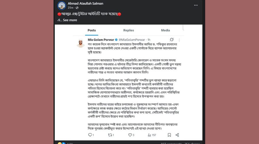 এবার জামায়াত সেক্রেটারি জেনারেল গোলাম পরওয়ারের এক্স অ্যাকাউন্ট হ্যাক