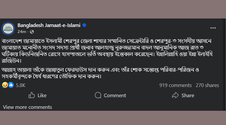 এদিকে বাংলাদেশ জামায়াতে ইসলামীর ভেরিফায়েড ফেসবুক পেজে এক পোস্টে বলা হয়েছে, শেরপুর জেলা শাখার সেক্রেটারি ও শেরপুর-৩ সংসদীয় আসনে জামায়াত মনোনীত সংসদ সদস্য প্রার্থী আলহাজ্ব নুরুজ্জামান বাদল আনুমানিক আজ রাত ৩ ঘটিকায় কিডনিজনিত রোগে হাসপাতালে ভর্তি অবস্থায় ইন্তেকাল করেছেন। ইন্নালিল্লাহি ওয়া ইন্না ইলাইহি রাজিউন। আল্লাহ তায়ালা তাকে জান্নাতুল ফেরদাউস দান করুন এবং তার শোক সন্তোপ্ত পরিবার-পরিজন ও সহকর্মীবৃন্দকে ধৈর্য ধারণের তৌফিক দান করুন।