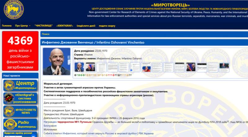 ফিফা প্রেসিডেন্ট জিয়ান্নি ইনফান্তিনোকে ইউক্রেনের ‘রাষ্ট্র-সমর্থিত’ মিরোতভোরেতস (Mirotvorets) ওয়েবসাইটের তথাকথিত ‘কিল লিস্ট’-এ অন্তর্ভুক্ত করা হয়েছে। বলা হচ্ছে, যাদের ইউক্রেন রাষ্ট্রের ‘শত্রু’ বলে মনে করা হয়, তাদের ব্যক্তিগত তথ্য প্রকাশ করে থাকে ওয়েবসাইটটি।