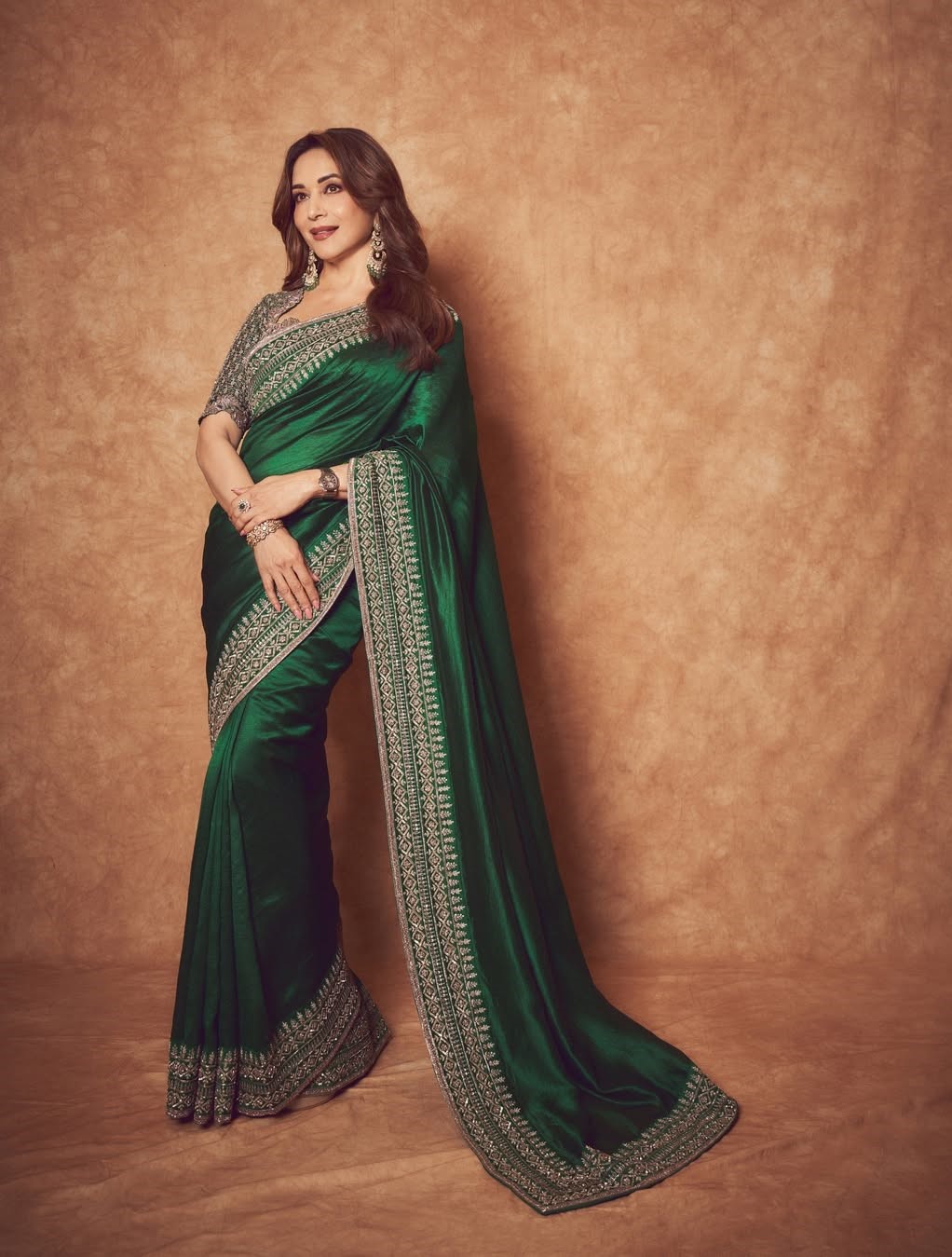 সম্প্রতি সামাজিক যোগাযোগমাধ্যমে শেয়ার করা একটি পোস্টে মাধুরী ধরা দিয়েছেন শাড়ির সৌন্দর্যে মোড়ানো এক রাজকীয় লুকে। সবুজ সিল্কের এই শাড়িটি এমন এক এলিগ্যান্স তুলে ধরে, যা ২০২৬ সালের বিবাহ ও উৎসবের মৌসুমে সব বয়সী নারীর জন্য সহজেই অনুকরণযোগ্য।