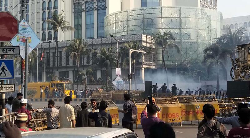 আজ (শুক্রবার) বিকেল ৩টা ৫০ মিনিটের দিকে ইন্টারকন্টিনেন্টাল মোড় থেকে যমুনা অভিমুখে যাওয়ার সময় পুলিশের ব্যারিকেড ভেঙে সামনে এগিয়ে যেতে গেলে পুলিশ ইনকিলাব মঞ্চের নেতাকর্মীদের বাধা দেয়। এসময় আন্দোলনকারীদের ছত্রভঙ্গ করতে পুলিশ জলকামান ও টিয়ারগ্যাস ব্যবহার করে।