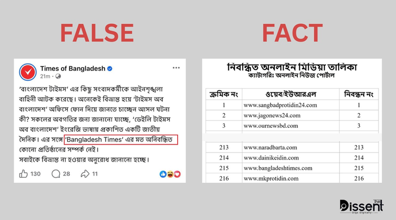তবে পোস্টে ‘Bangladesh Times’-কে 'অনিবন্ধিত প্রতিষ্ঠান' হিসেবে উল্লেখ করা হলেও বাস্তবে তথ্য অধিদফতরের ওয়েবসাইটে ''নিবন্ধিত অনলাইন মিডিয়া তালিকা"-তে Bangladesh Times এর নাম রয়েছে।