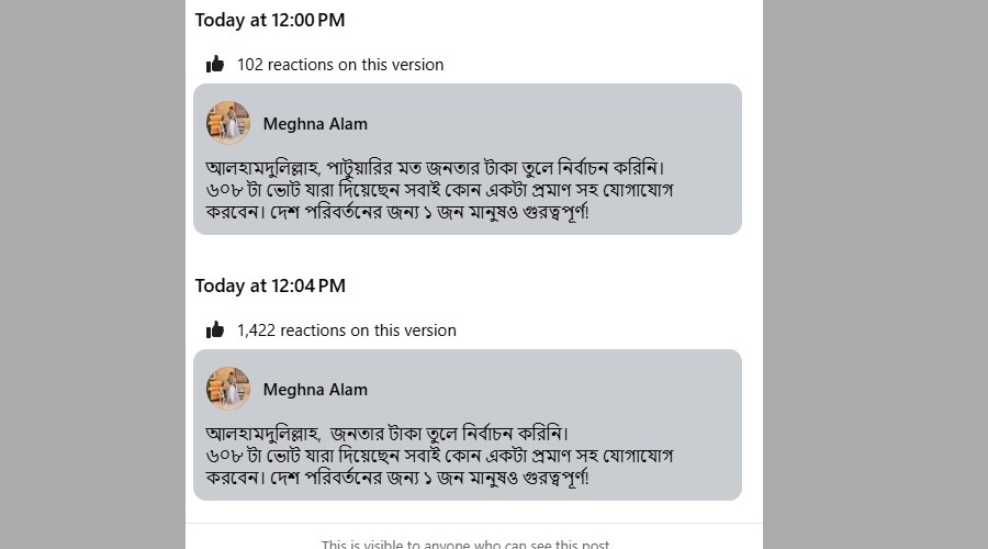 তবে পোস্টটি প্রকাশের কয়েক মিনিট পর তিনি পাটওয়ারীর নাম সরিয়ে সংশোধিত বার্তা দেন। নতুন পোস্টে তিনি লেখেন, আলহামদুলিল্লাহ, জনতার টাকা তুলে নির্বাচন করিনি। ৬০৮টি ভোট যারা দিয়েছেন, সবাই কোনো একটি প্রমাণসহ যোগাযোগ করবেন। দেশ পরিবর্তনের জন্য ১ জন মানুষও গুরুত্বপূর্ণ।