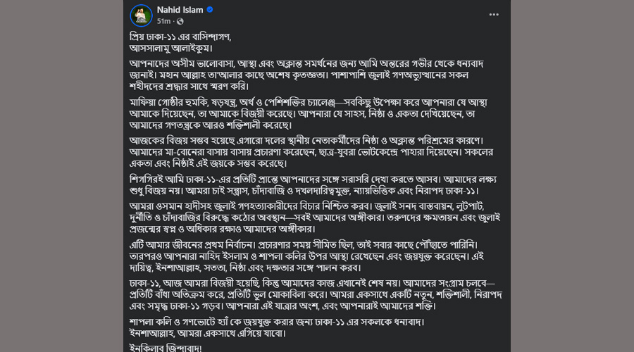 আজ রবিবার নিজের ভেরিফায়েড ফেসবুক পেজে ঢাকা-১১ আসনের বাসিন্দাদের ধন্যবাদ জানিয়ে দেওয়া এক পোস্টে এ কথা বলেন নাহিদ ইসলাম। তিনি ন্যায়ভিত্তিক এবং নিরাপদ ঢাকা-১১ গড়ার অঙ্গীকার করেন।