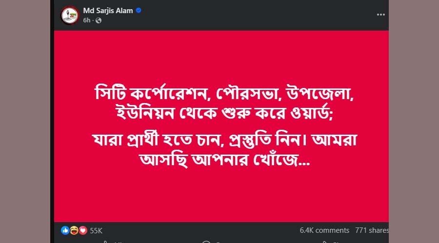 আসন্ন স্থানীয় সরকার নির্বাচনকে সামনে রেখে ‘স্থানীয় সরকার নির্বাচন পরিচালনা কমিটি’ গঠন করেছে জাতীয় নাগরিক পার্টি (এনসিপি)। এই কমিটির চেয়ারম্যান হিসেবে দায়িত্ব দেওয়া হয়েছে এনসিপির উত্তরাঞ্চলের মুখ্য সংগঠক সারজিস আলমকে।