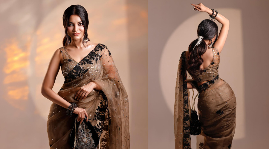 ছবিতে নাজিফাকে দেখা যাচ্ছে এক অনন্য ও পরিমিত গ্ল্যামারের সঙ্গে রাজকীয় উপস্থিতিতে। তিনি পরেছেন কফি-বাদামি শেডের অরগ্যানজা শাড়ি, যা সূক্ষ্ম সিকুইন ও ছোট স্টোনের কাজের মাধ্যমে আভা ছড়াচ্ছে। শাড়ির সবচেয়ে দৃষ্টি আকর্ষণকারী অংশ হল কালো ফ্লোরাল এমব্রয়ডারি। পাড় ও আঁচলে এই কনট্রাস্ট পুরো লুককে করেছে আরও নজরকাড়া। সঙ্গে রয়েছে ম্যাচিং স্লিভলেস ডিপ নেকলাইন ব্লাউজ, যা সাজানো সূক্ষ্ম অলংকরণ দিয়ে। আউটফিটটি এসেছে ক্লদিং ব্র্যান্ড ‘প্রিয়ালি’ থেকে।