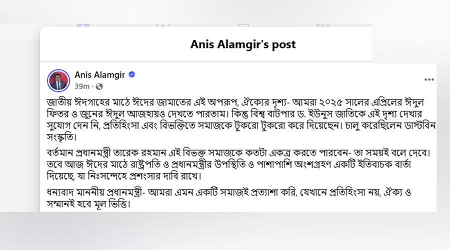 তবে আজ ঈদের মাঠে রাষ্ট্রপতি ও প্রধানমন্ত্রীর উপস্থিতি ও পাশাপাশি অংশগ্রহণ একটি ইতিবাচক বার্তা দিয়েছে, যা নিঃসন্দেহে প্রশংসার দাবি রাখে। ধন্যবাদ মাননীয় প্রধানমন্ত্রী। আমরা এমন একটি সমাজই প্রত্যাশা করি, যেখানে প্রতিহিংসা নয়, ঐক্য ও সম্মানই হবে মূল ভিত্তি।’
