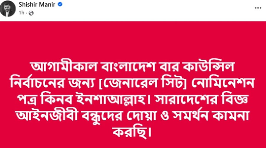ফেসবুক পোস্টে অ্যাডভোকেট শিশির মনির লিখেছেন, আগামীকাল বাংলাদেশ বার কাউন্সিল নির্বাচনের জন্য [জেনারেল সিট] মনোনয়ন পত্র কিনব ইনশাআল্লাহ। সারাদেশের বিজ্ঞ আইনজীবী বন্ধুদের দোয়া ও সমর্থন কামনা করছি।