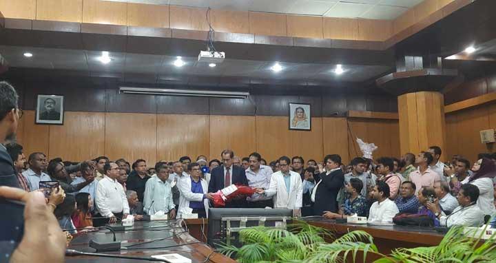 এর আগে বেলা ১২টা ১৫ মিনিটের দিকে স্বপরিবারে তিনি বঙ্গবন্ধু শেখ মুজিব মেডিকেল বিশ্ববিদ্যালয়ে প্রবেশ করেন ডা. দীন মোহাম্মদ নূরুল হক। এ সময় বিশ্ববিদ্যালয়ের চিকিৎসক-নার্সসহ কর্মকর্তা-কর্মচারীরা তাকে ফুল দিয়ে বরণ করেন।
