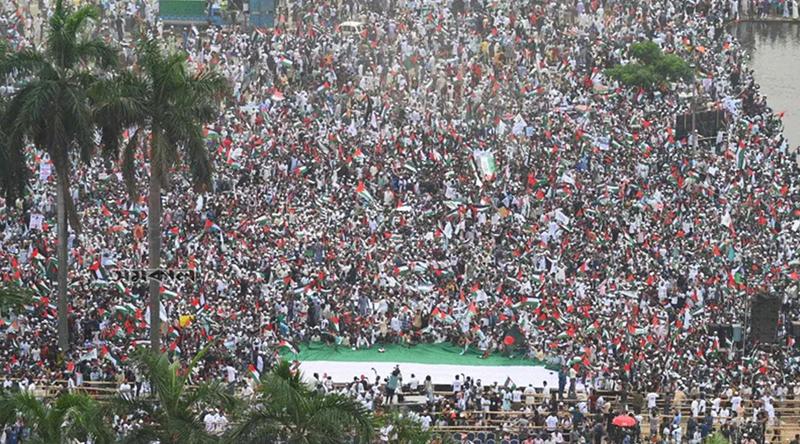 প্রতিবেদনে লেখা হয়েছে, বাংলাদেশের রাজধানীতে হাজার হাজার বিক্ষোভকারী গাজায় হামলার নিন্দা জানাতে র‌্যালি করেছেন। ঢাকা বিশ্ববিদ্যালয় এলাকার সোহরাওয়ার্দী পার্কে প্রায় ১ লাখ বিক্ষোভকারী জড়ো হয়েছিল। তাদের সঙ্গে ছিল কয়েকশ ফিলিস্তিনি পতাকা। সেখানে তারা ‘ফ্রি ফ্রি, ফিলিস্তিন’-এর মতো স্লোগান দিয়েছেন।